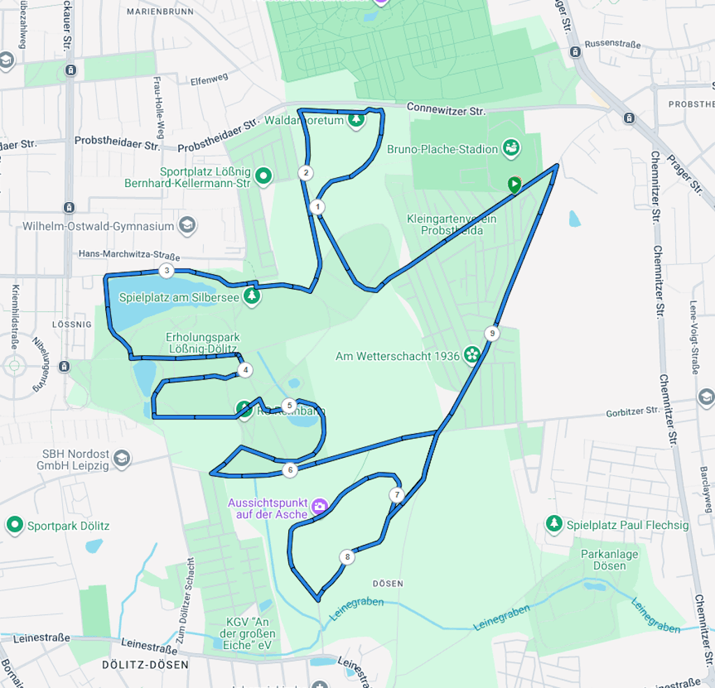 Diese Strecke wird beim 10-km-Lauf einmal, beim 20-km-Lauf zweimal entgegen dem Uhrzeigersinn durchlaufen.